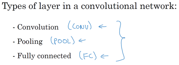 But for now I'll just point out that as you go deeper in the neural network, usually nh and nw to height and width will decrease. Pointed this out earlier, but it goes from 32 x 32, to 20 x 20, to 14 x 14, to 10 x 10, to 5 x 5. So as you go deeper usually the height and width will decrease, whereas the number of channels will increase. It's gone from 3 to 6 to 16, and then your fully connected layer is at the end.