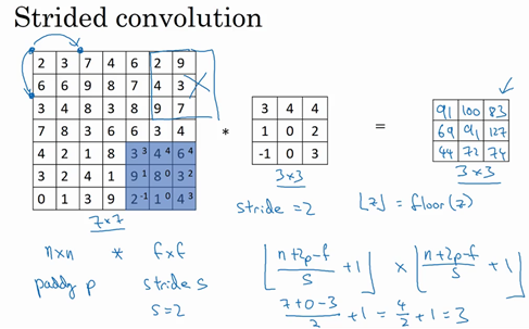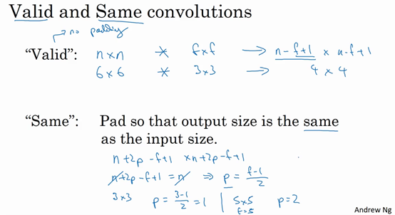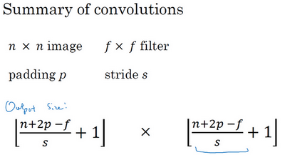 我们在之前视频中看到,如果你用一个3×3的过滤器卷积一个6×6的图像,你最后会得到一个4×4的输出,也就是一个4×4矩阵。那是因为你的3×3过滤器在6×6矩阵中,只可能有4×4种可能的位置。这背后的数学解释是,如果我们有一个的图像,用的过滤器做卷积,那么输出的维度就是。在这个例子里是,因此得到了一个4×4的输出。