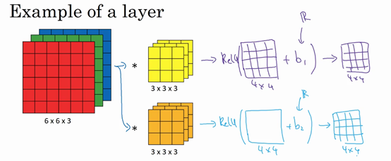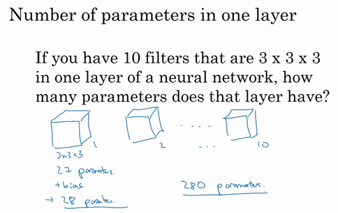 And so, each of these feature detectors, each of these aqua's can use the same parameters in lots of different positions in your input image in order to detect say a vertical edge or some other feature. And I think this is true for low-level features like edges, as well as the higher level features, like maybe, detecting the eye that indicates a face or a cat or something there. But being with a share in this case the same nine parameters to compute all 16 of these aquas, is one of the ways the number of parameters is reduced.