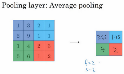 另外还有一种类型的池化,平均池化,它不太常用。我简单介绍一下,这种运算顾名思义,选取的不是每个过滤器的最大值,而是平均值。示例中,紫色区域的平均值是3.75,后面依次是1.25、4和2。这个平均池化的超级参数,,我们也可以选择其它超级参数。