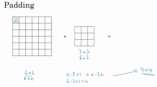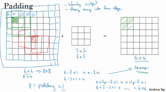 What we saw in earlier videos is that if you take a six by six image and convolve it with a three by three filter, you end up with a four by four output with a four by four matrix, and that's because the number of possible positions with the three by three filter, there are only, sort of, four by four possible positions, for the three by three filter to fit in your six by six matrix. And the math of this this turns out to be that if you have a end by end image and to involved that with an f by f filter, then the dimension of the output will be; n minus f plus one by n minus f plus one. And in this example, six minus three plus one is equal to four, which is why you wound up with a four by four output.