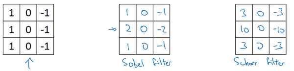 But computer vision researchers will use other sets of numbers as well, like maybe instead of a 1, 2, 1, it should be a 3, 10, 3, right? And then -3, -10, -3. And this is called a Scharr filter. And this has yet other slightly different properties. And this is just for vertical edge detection. And if you flip it 90 degrees, you get horizontal edge detection.