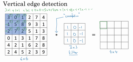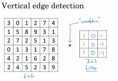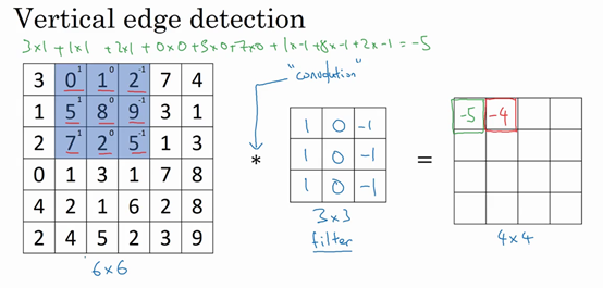 A 6 by 6 matrix convolve of the 3 by 3 matrix gives you a 4 by 4 matrix. And these are images and filters. These are really just matrices of various dimensions. But the matrix on the left is convenient to interpret as image, and the one in the middle we interpret as a filter and the one on the right, you can interpret that as maybe another image. And this turns out to be a vertical edge detector, and you see why on the next slide.