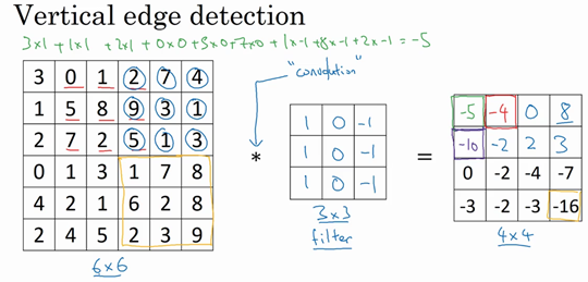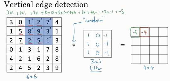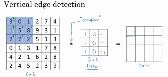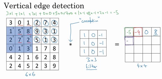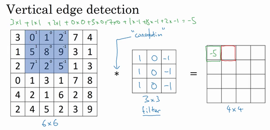The output of this convolution operator will be a 4 by 4 matrix, which you can interpret, which you can think of as a 4 by 4 image. The way you compute this 4 by 4 output is as follows, to compute the first elements, the upper left element of this 4 by 4 matrix, what you are going to do is take the 3 by 3 filter and paste it on top of the 3 by 3 region of your original input image. I have written here 1, 1, 1, 0, 0, 0, -1, -1, -1. And what you should do is take the element wise product so the first one would be three times 1 and then the second one would be one times one I'm going down here, one times one and then plus two times one, just one and then add up all of the resulting nine numbers. So then the middle column gives you zero times zero, plus five times zero, plus seven times zero and then the right most column gives one times -1, eight times -1, plus two times -1. Adding up these nine numbers will give you negative 5 and so I'm going to fill in negative 5 over here.