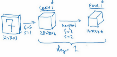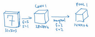 Next, let's apply a pooling layer, so I am going to apply mass pooling here and let's use a f=2, s=2. When I don't write a padding use a pad easy with a 0. Next let's apply a pooling layer, I am going to apply, let's see max pooling with a 2 x 2 filter and the stride equals 2. So this is should reduce the height and width of the representation by a factor of 2. So 28 x 28 now becomes 14 x 14, and the number of channels remains the same so 14 x 14 x 6, and we're going to call this the Pool 1 output.