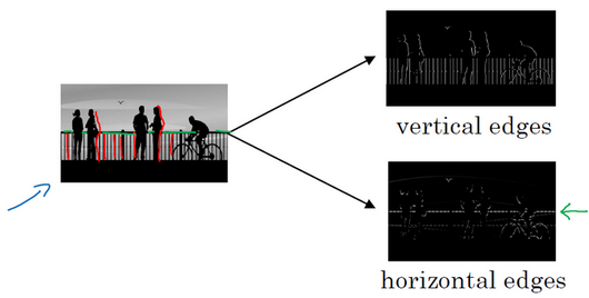 Lets take an example. Given a picture like that for a computer to figure out what are the objects in this picture, the first thing you might do is maybe detect vertical edges in this image. For example, this image has all those vertical lines, where the buildings are, as well as kind of vertical lines idea all lines of these pedestrians and so those get detected in this vertical edge detector output. And you might also want to detect horizontal edges so for example, there is a very strong horizontal line where this railing is and that also gets detected sort of roughly here. How do you detect edges in image like this?