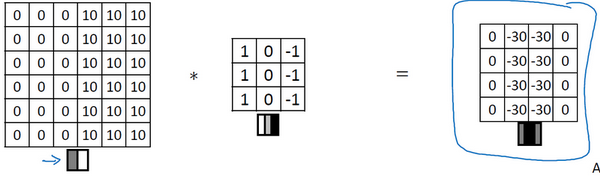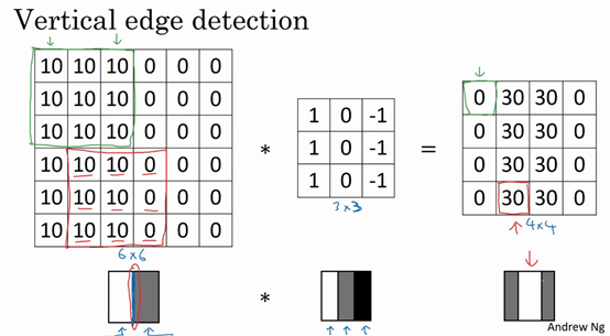 When you convolve this with the 3 by 3 filter and so this 3 by 3 filter can be visualized as follows, where is lighter, brighter pixels on the left and then this mid tone zeroes in the middle and then darker on the right. What you get is this matrix on the right. Just to verify this math if you want, this zero for example, is obtained by taking the element wise products and then multiplying with this 3 by 3 block and so you get from the left column 10 plus 10 plus 10 and then zeroes in the middle and then -10, -10, -10 which is why you end up with zero over here. Whereas in contrast, if that 30 will be obtained from this, which you get from having 10 plus 10 plus 10 and then minus zero, minus zero which is why you end up with a 30 over there.