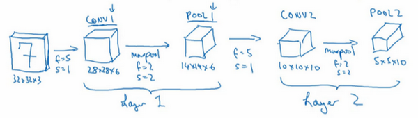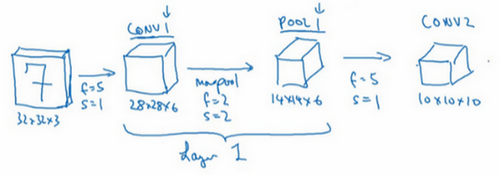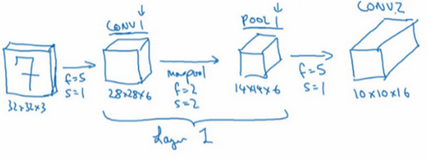 So, it turns out that in the literature of a ConvNet there are two conventions which are inside the inconsistent about what you call a layer. One convention is that this is called one layer. So this will be layer one of the neural network, and now the conversion will be to call they convey layer as a layer and the pool layer as a layer. When people report the number of layers in a neural network usually people just record the number of layers that have weight, that have parameters. And because the pooling layer has no weights, has no parameters, only a few hyper parameters, I'm going to use a convention that Conv 1 and Pool 1 shared together. I'm going to treat that as Layer 1, although sometimes you see people maybe read articles online and read research papers, you hear about the conv layer and the pooling layer as if they are two separate layers. But this is maybe two slightly inconsistent notation terminologies, but when I count layers, I'm just going to count layers that have weights. So achieve both of this together as Layer 1.