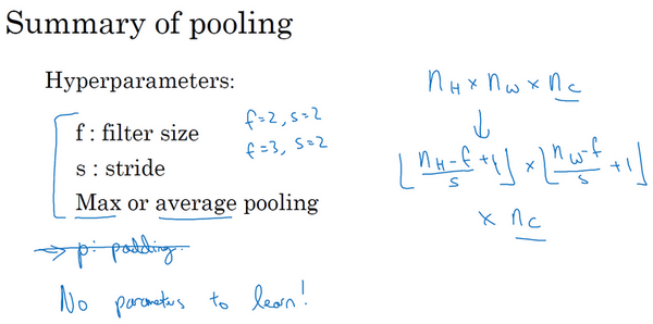 One interesting property of max pooling is that it has a set of hyperparameters but it has no parameters to learn. There's actually nothing for gradient descent to learn. Once you fix f and s, it's just a fixed computation and gradient descent doesn't change anything.