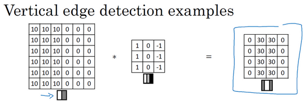 还是上一个视频中的例子,这张6×6的图片,左边较亮,而右边较暗,将它与垂直边缘检测滤波器进行卷积,检测结果就显示在了右边这幅图的中间部分。