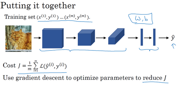 So, to train this neural network, all you need to do is then use gradient descents or some of the algorithm like, gradient descent momentum, or RMSProp or Adam, or something else, in order to optimize all the parameters of the neural network to try to reduce the cost function J. And you find that if you do this, you can build a very effective cat detector or some other detector.
