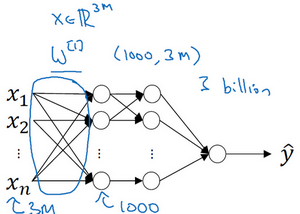 But if you have three million input features, then this means that X here will be three million dimensional. And so, if in the first hidden layer maybe you have just a 1000 hidden units, then the total number of weights that is the matrix W1, if you use a standard or fully connected network like we have in courses one or two. This matrix will be a 1000 by 3 million dimensional matrix. Because X is now R by three million. 3m. I'm using to denote three million. And this means that this matrix here will have three billion parameters which is just very, very large. And with that many parameters, it's difficult to get enough data to prevent a neural network from overfitting. And also, the computational requirements and the memory requirements to train a neural network with three billion parameters is just a bit infeasible.