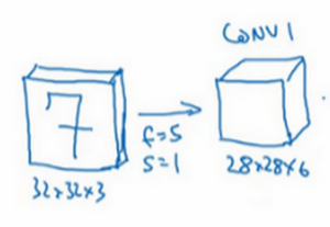 let's apply another convolutional layer to it, let's use a filter size that's 5 x 5, and let's use a stride of 1, and let's use 10 filters this time. So now you end up with, A 10 x 10 x 10 volume, so I'll call this Comv 2,