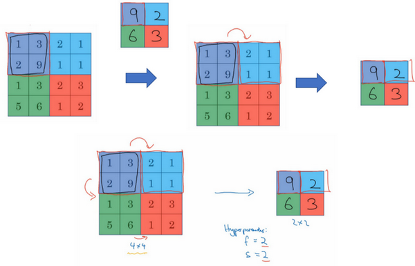 So just to summarize, the hyperparameters for pooling are f, the filter size and s, the stride, and maybe common choices of parameters might be f equals two, s equals two. This is used quite often and this has the effect of roughly shrinking the height and width by a factor of above two, and a common chosen hyperparameters might be f equals two, s equals two, and this has the effect of shrinking the height and width of the representation by a factor of two. I've also seen f equals three, s equals two used, and then the other hyperparameter is just like a binary bit that says, are you using max pooling or are you using average pooling. If you want, you can add an extra hyperparameter for the padding although this is very, very rarely used. When you do max pooling, usually, you do not use any padding, although there is one exception that we'll see next week as well.