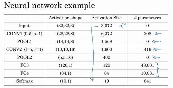 So let's just go through for this neural network some more details of what are the activation shape, the activation size, and the number of parameters in this network. So the input was 32 x 30 x 3, and if you multiply out those numbers you should get 3,072. So the activation, a0 has dimension 3072. Well it's really 32 x 32 x 3. And there are no parameters I guess at the input layer. And as you look at the different layers, feel free to work out the details yourself. These are the activation shape and the activation sizes of these different layers.