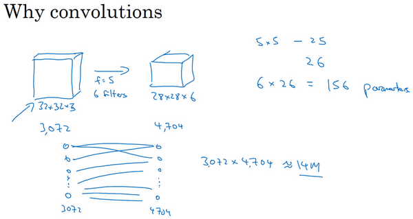 Let's say you have a 32 by 32 by 3 dimensional image, and this actually comes from the example from the previous video, but let's say you use five by five filter with six filters. And so, this gives you a 28 by 28 by 6 dimensional output. So, 32 by 32 by 3 is 3,072, and 28 by 28 by 6 if you multiply all those numbers is 4,704. And so, if you were to create a neural network with 3,072 units in one layer, and with 4,704 units in the next layer, and if you were to connect every one of these neurons, then the weight matrix, the number of parameters in a weight matrix would be 3,072 times 4,704 which is about 14 million. So, that's just a lot of parameters to train. And today you can train neural networks with even more parameters than 14 million, but considering that this is just a pretty small image, this is a lot of parameters to train.