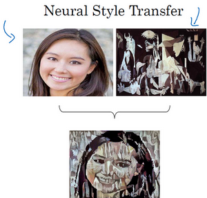 Here's another example, maybe a more fun one is neural style transfer. Let's say you have a picture, and you want this picture repainted in a different style. So neural style transfer, you have a content image, and you have a style image. The image on the right is actually a Picasso. And you can have a neural network put them together to repaint the content image (that is the image on the left), but in the style of the image on the right, and you end up with the image at the bottom. So, algorithms like these are enabling new types of artwork to be created. And in this course, you'll learn how to do this yourself as well.