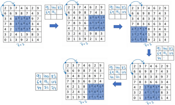 But in this example, let's compute each of the elements of this three by three output. The upper left-hand elements, we're going to look over that region. So notice this is a three by three region because the filter size is three and to the max there. So, that will be nine, and then we shifted over by one because which you can stride at one. So, that max in the blue box is nine. Let's shift that over again. The max of the blue box is five. And then let's go on to the next row, a stride of one. So we're just stepping down by one step. So max in that region is nine, max in that region is nine, max in that region, it's now with a two fives, we have maxes of five. And then finally, max in that is eight. Max in that is six, and max in that, this is not [inaudible]. Okay, so this, with this set of hyperparameters f equals three, s equals one gives that output shown [inaudible].