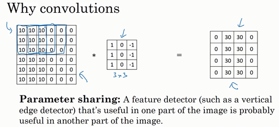 One is parameter sharing. And parameter sharing is motivated by the observation that feature detector such as vertical edge detector, that's useful in one part of the image is probably useful in another part of the image. And what that means is that, if you've figured out say a three by three filter for detecting vertical edges, you can then apply the same three by three filter over here, and then the next position over, and the next position over, and so on.