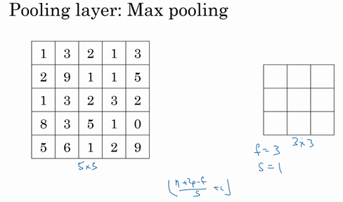 Let's go through an example with some different hyperparameters. Here, I am going to use, sure you have a five by five input and we're going to apply max pooling with a filter size that's three by three. So f is equal to three and let's use a stride of one. So in this case, the output size is going to be three by three. And the formulas we had developed in the previous videos for figuring out the output size for conv layer, those formulas also work for max pooling. So, that's n plus 2p minus f over s plus 1. That formula also works for figuring out the output size of max pooling.