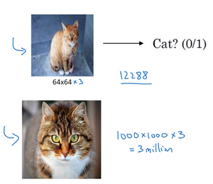 If you work with larger images, maybe this is a 1000 pixel by 1000 pixel image, and that's actually just one megapixel. But the dimension of the input features will be 1000 by 1000 by 3, because you have three RGB channels, and that's three million. If you are viewing this on a smaller screen, this might not be apparent, but this is actually a low res 64 by 64 image, and this is a higher res 1000 by 1000 image.