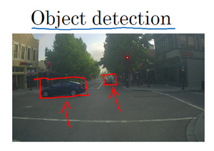 还有一个例子,在计算机视觉中有个问题叫做目标检测,比如在一个无人驾驶项目中,你不一定非得识别出图片中的物体是车辆,但你需要计算出其他车辆的位置,以确保自己能够避开它们。所以在目标检测项目中,首先需要计算出图中有哪些物体,比如汽车,还有图片中的其他东西,再将它们模拟成一个个盒子,或用一些其他的技术识别出它们在图片中的位置。注意在这个例子中,在一张图片中同时有多个车辆,每辆车相对与你来说都有一个确切的距离。
